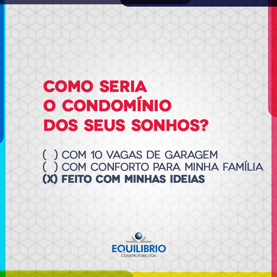 Após o desenvolvimento dos projetos de ambientação do Grand Club Alfredo Fernandes, em Manaíra e do Edifício Ávila, em Tambaú, fechamos agora um novo projeto – bastante ousado, diga-se de passagem - com a construtora Equilíbrio. O primeiro condomínio colaborativo no nosso Estado ainda não tem nome nem programa de atividades definido, pois aguarda as sugestões dos consumidores. Quer nos ajudar a construir estes conceitos? Acesse a página do empreendimento e participe da enquete: www.equilibriodeideias.com.br