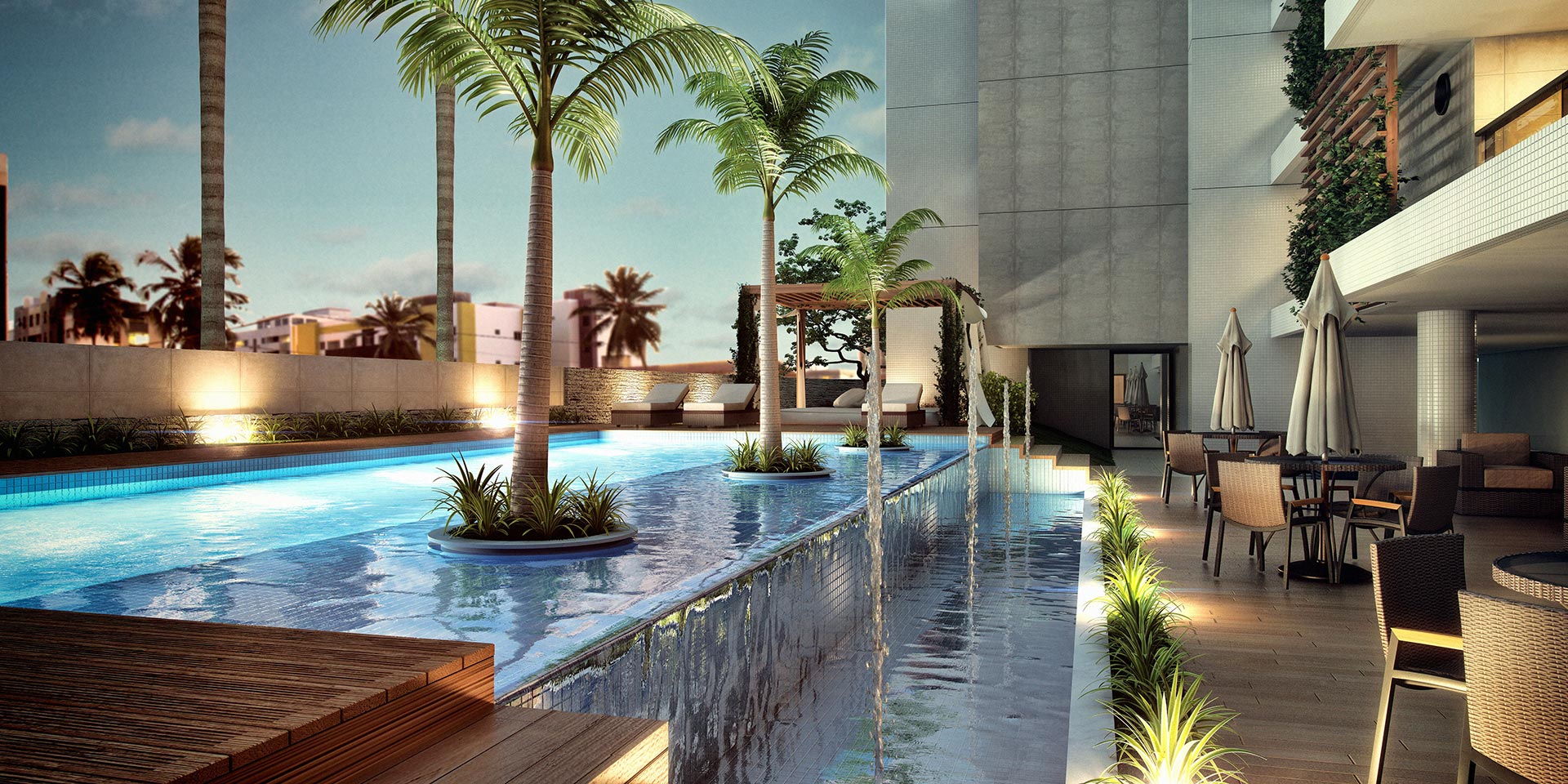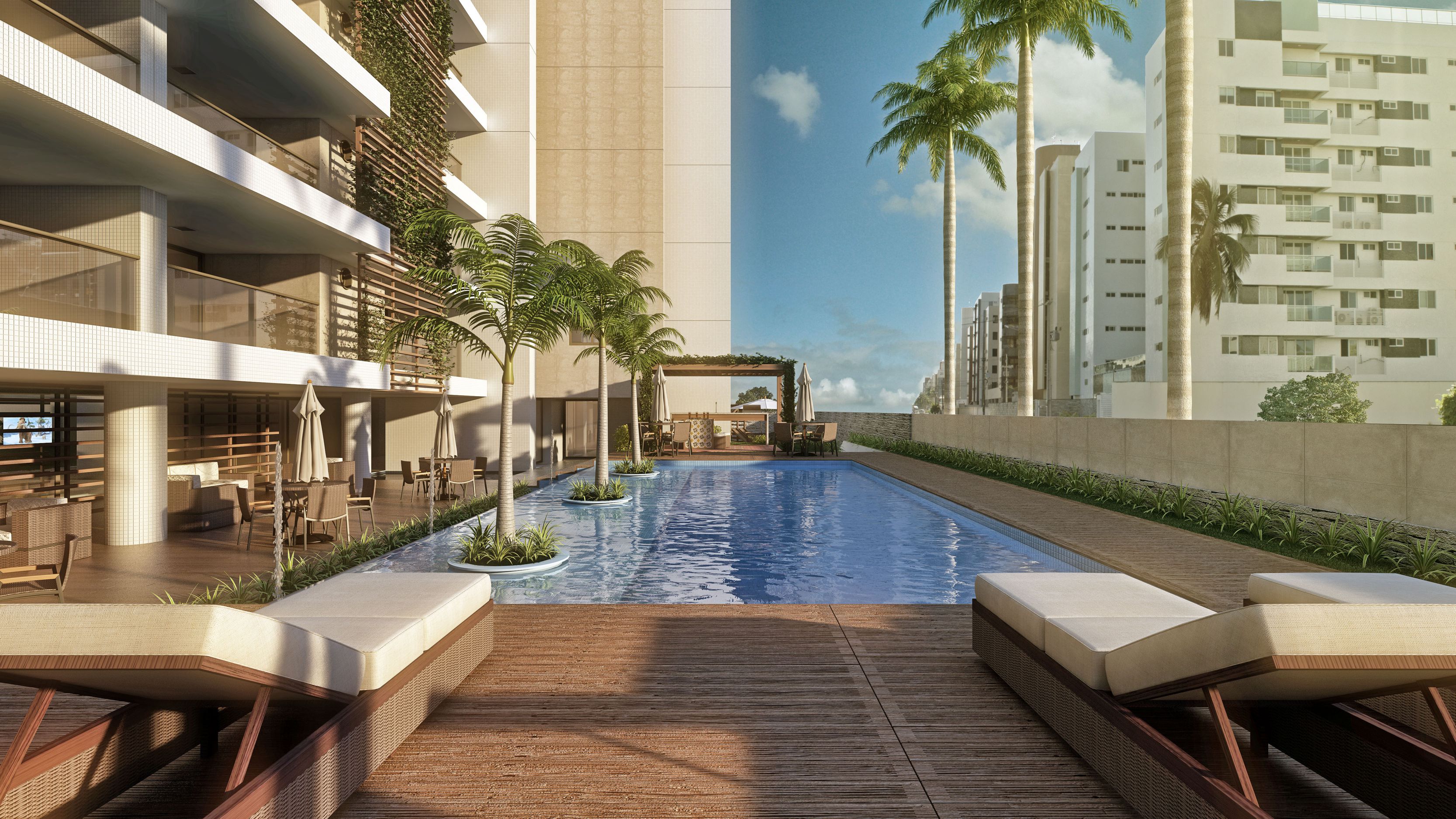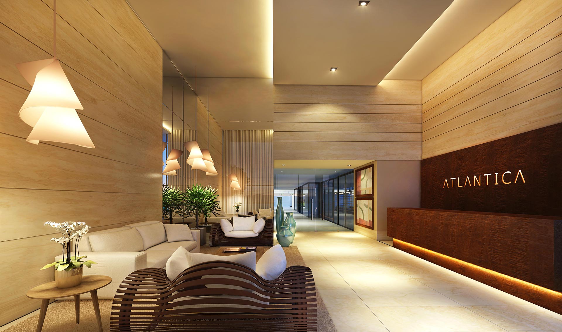 Localizado em Intermares, o Atlântica Beach Residences inspira saúde, bem estar e lazer. E foi com base neste conceito que nasceu o projeto de interiores e ambientação deste empreendimento. O interno e o externo estão totalmente integrados, trazendo além dos jardins, piscinas e espelhos d’água, o frescor da paisagem de Intermares para dentro dos ambientes. Buscando o conforto e a funcionalidade, foram desenvolvidos espaços pioneiros, como o Snooker bar, Fun Place e Outdoor Spa, que convidam todos os públicos a desfrutar de uma vida mais divertida, leve e saudável. A configuração do masterplan naturalmente promove o convívio social e o projeto de interiores o complementa, delineando ambientes despojados e joviais, sem perder a elegância e requinte que um empreendimento deste porte merece.